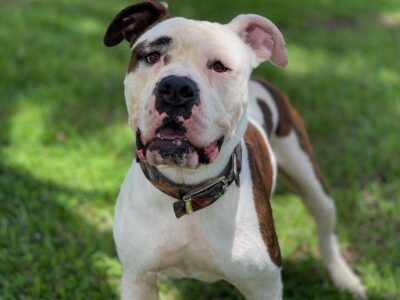 Bubba is a 3 year old Neutered American Bulldog. This big boy weighs 85 lbs. and although he is good with female dogs sometimes due to his large size he plays a little too rough for smaller dogs to handle.